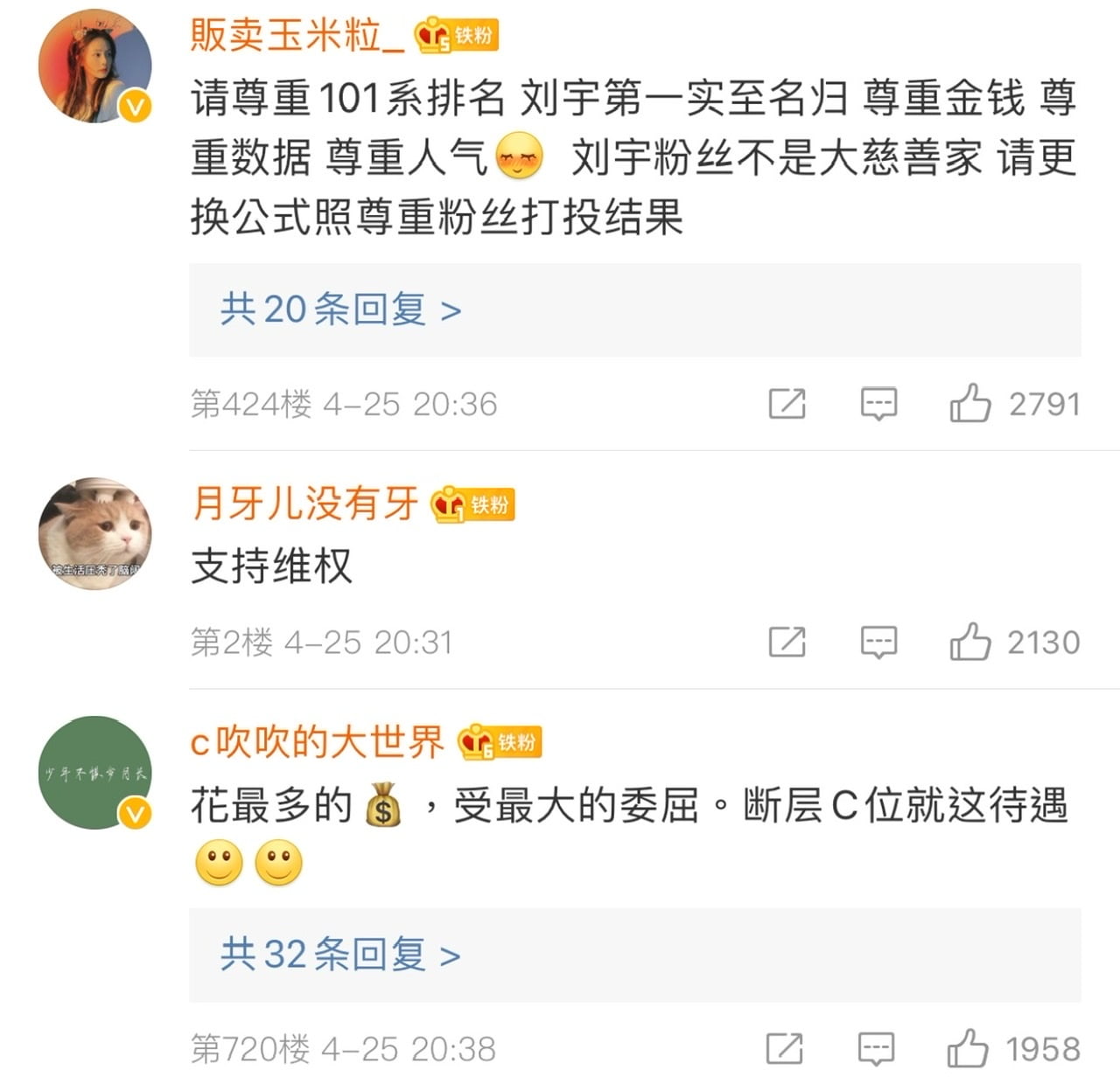 來看看部分熱評:「請尊重101系排名 劉宇第一實至名歸 尊重金錢 尊重數據 尊重人氣 劉宇粉絲不是大慈善家 請更換公式照尊重粉絲打投結果」、「支持維權」、「花最多的💰,受最大的委屈。 斷層C位就這待遇[微笑][微笑]」