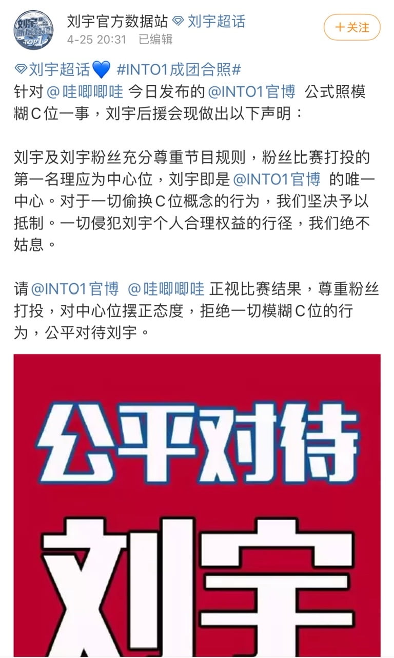 團員們脫下了制服的第一張官方合照,卻迅速登上了熱搜,其中很大一部分原因,是因為劉宇的粉絲開始維權,希望公平對待劉宇,明確正視劉宇的C位!