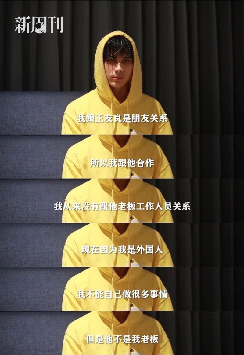 「我跟王友良是朋友關係,所以我跟他合作,我從來沒有跟他是老板工作人員的關係。現在因為我是外國人,我不能自己做很多事情,但是他不是我的老板,我也不是他藝人,但是我相信他。」