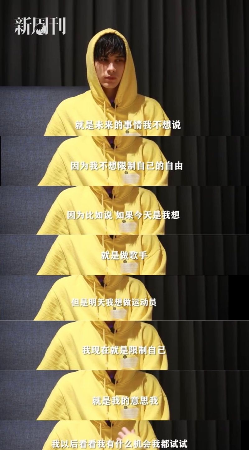 「未來的事情我不想說,因為我不想限制自己的自由,比如說如果今天我想做歌手,但是明天我想做運動員,我現在就是限制自己,我以後什麽機會我都試試。」