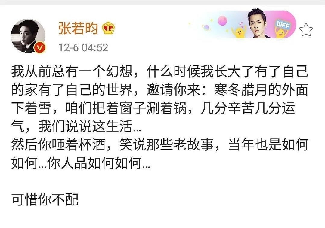據悉張若昀從小跟著爺爺奶奶生活,爸爸基本沒管過,一個接一個的小三把他媽媽逼去了美國,連帶著媽媽也不肯見他,至今三十歲想見媽媽而不能。張若昀曾發文,疑似影射父親。