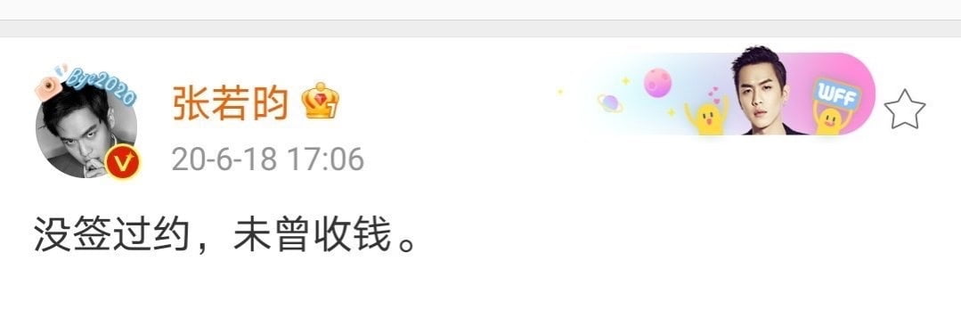 去年6月,媒體曾曝光張若昀涉1.4億違約糾紛一事,當時張若昀發文回應稱“沒簽過約,未曾收錢。