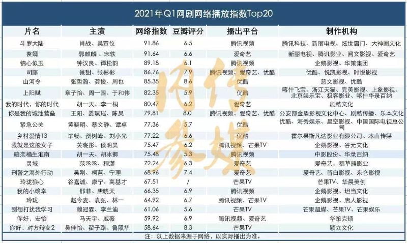 來!小編最喜歡看這種數據帖!速看看2021年第一季度網絡播放指數最高的前20部網劇,究竟你看了幾部呢?