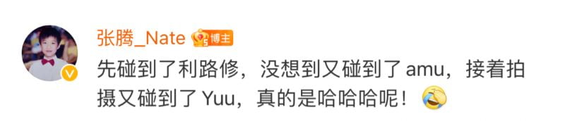 表示之前小編報道過,同是闖人的張騰在北京三里屯逛街時偶遇了利路修,而他隨後也有在微博下補充,表示自己先遇到了利路修,才遇到了Amu,接著又碰到了Yuu!