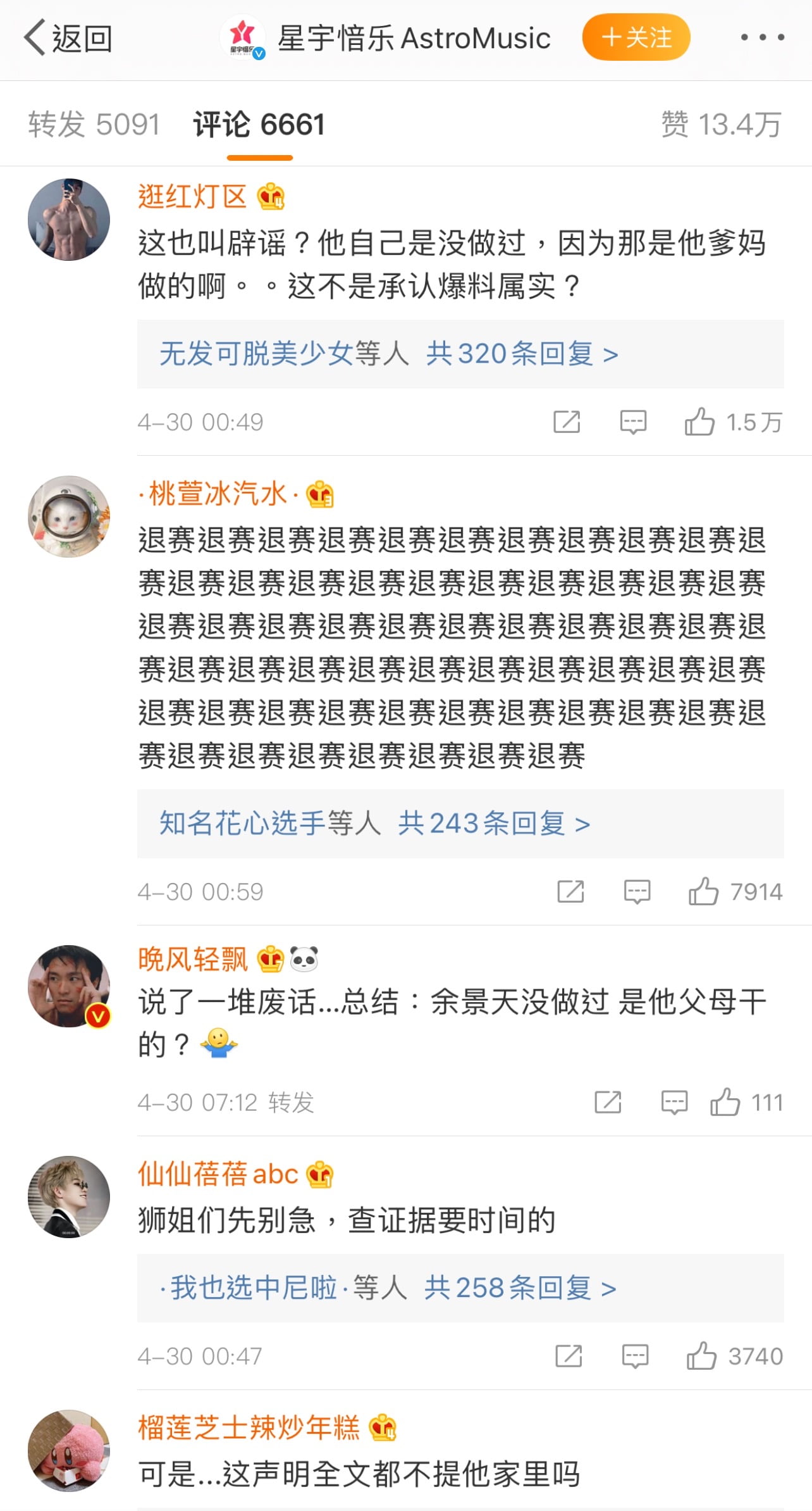 也來看看網友在官微下的回應,熱評第一:「這也叫闢謠? 他自己是沒做過,因為那是他爹媽做的啊。 。 這不是承認爆料屬實?」、「退賽退賽退賽退賽退賽退賽退賽退賽退賽退賽退賽退賽退賽退賽退賽退賽退賽退賽退賽退賽退賽退賽退賽退賽退賽 退賽退賽退賽退賽退賽退賽退賽退賽退賽退賽退賽退賽退賽退賽退賽退賽退賽退賽退賽退賽退賽退賽退賽退賽退賽 退賽退賽退賽退賽退賽退賽退賽退賽退賽退賽」、「說了一堆廢話…總結:余景天沒做過 是他父母幹的?」、「獅姐們先別急,查證據要時間的」、「可是…這聲明全文都不提他家裡嗎」