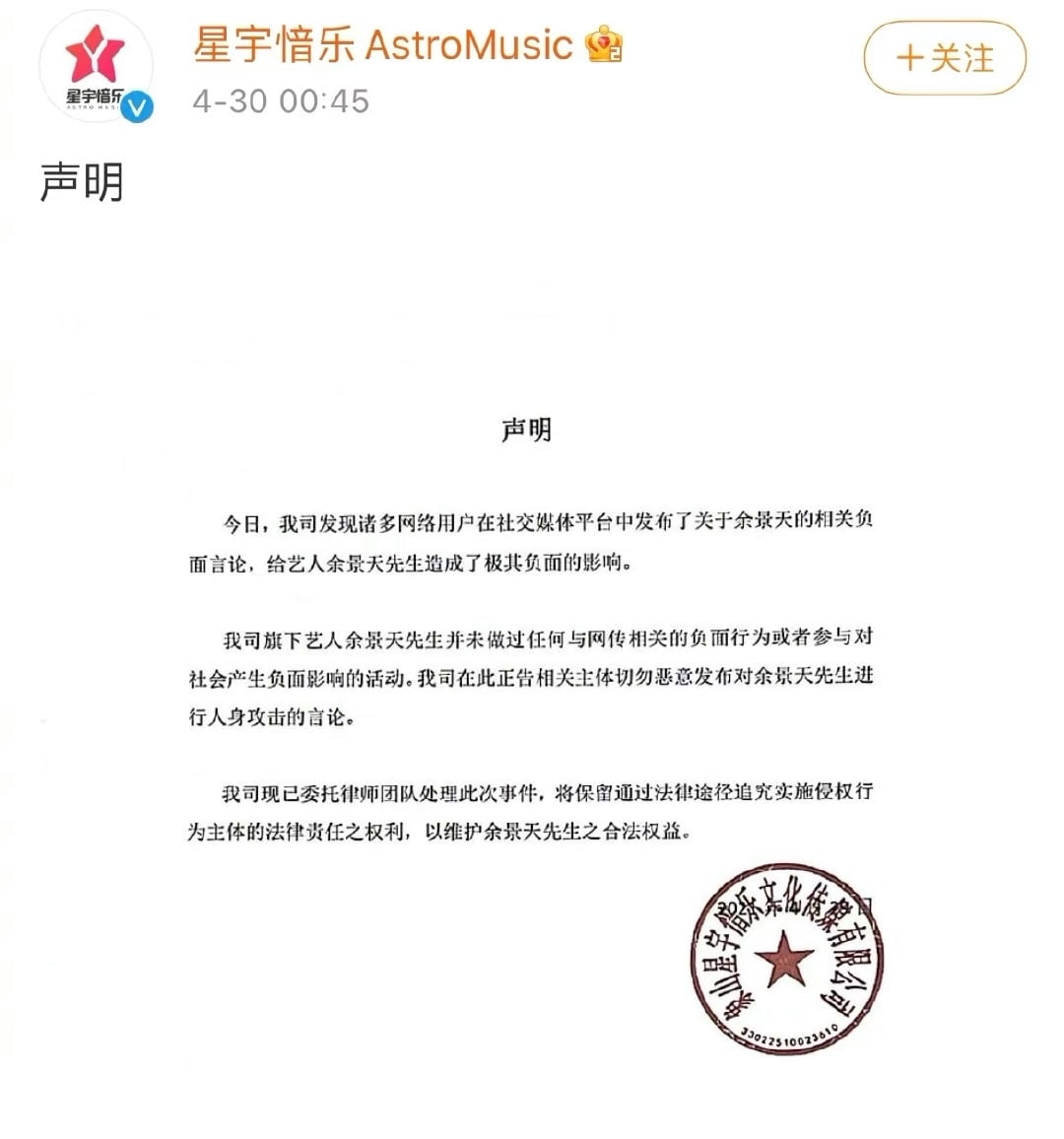 余景天經紀公司星宇愔樂發聲明闢謠,稱余景天並未做過任何與網傳相關的負面行為,或者參與對社會產生負面影響的活動。 公司警告相關主體切勿惡意發布對余景天進行人身攻擊的行為,並將委託律師處理此次事件。