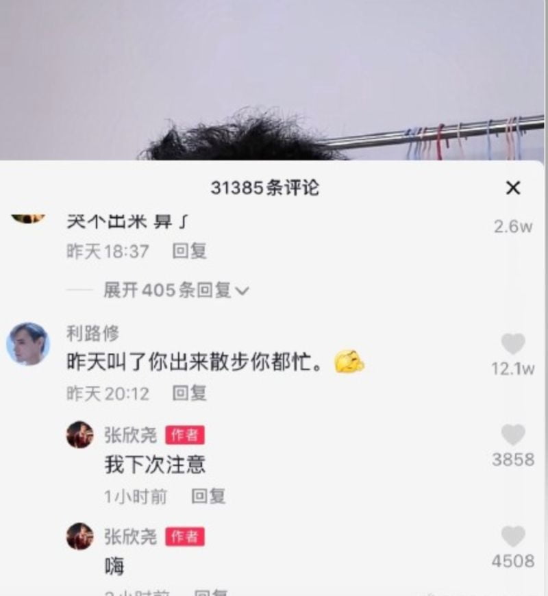 利老師究竟有多愛散步呢?從他約闖人的活動都是去三里屯散步就可以知道了!先是張欣堯一直在社交平台喊話利老師,說利老師都不回復自己的留言,但利老師在抖音回復張欣堯,表示:「昨天叫了你出來散步你都忙。」嚇得張欣堯忙回復:「我下次注意。」