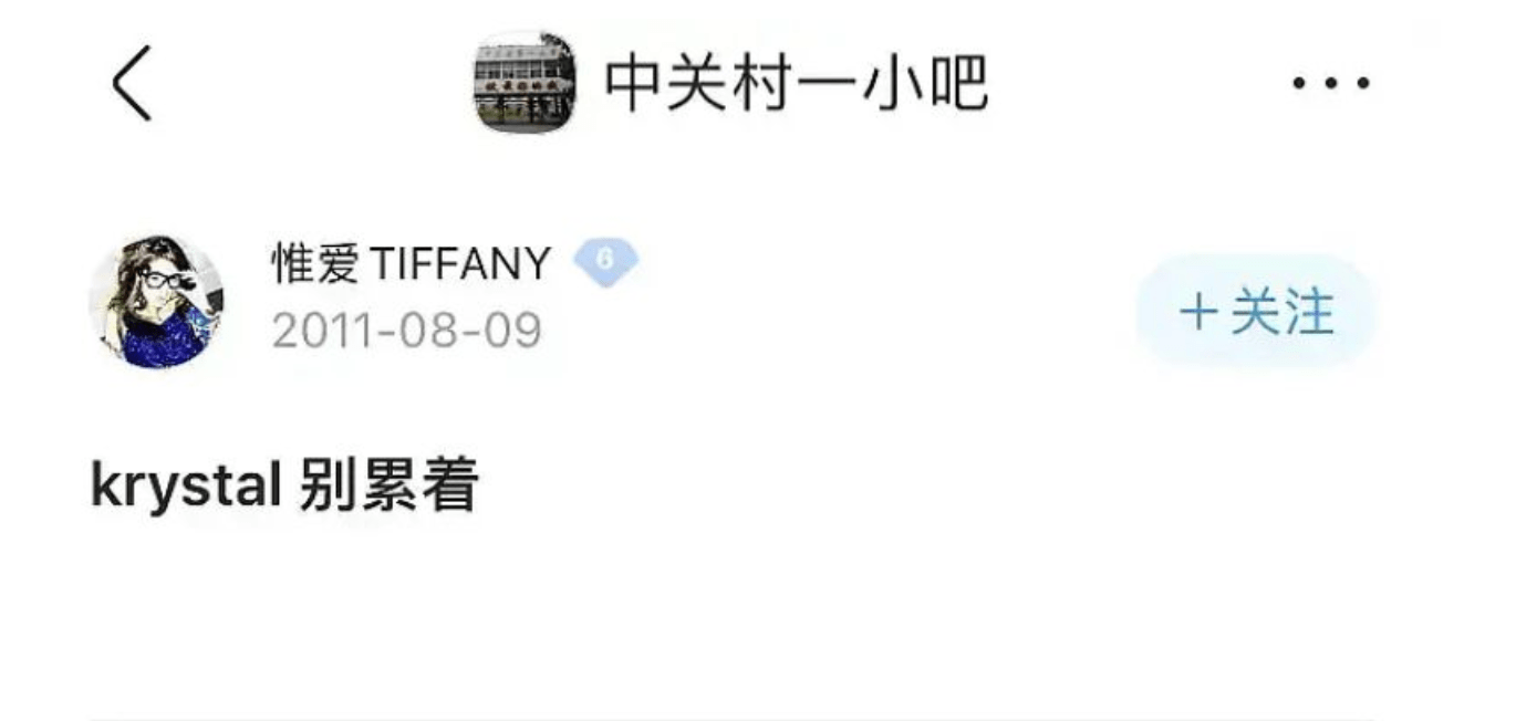 原來我們的南西公主,從小就對喜歡的東西很堅持啊!就像堅持要去《竹》舞台時一樣,喜歡的東西會不斷推廣,比如…ID叫做「惟愛Tiffany」!在自己小學貼吧中發的貼文是:「Krystal別累著」!又是少時Tiffany又是f(x)的Krystal,這妥妥的SM家族飯啊!
