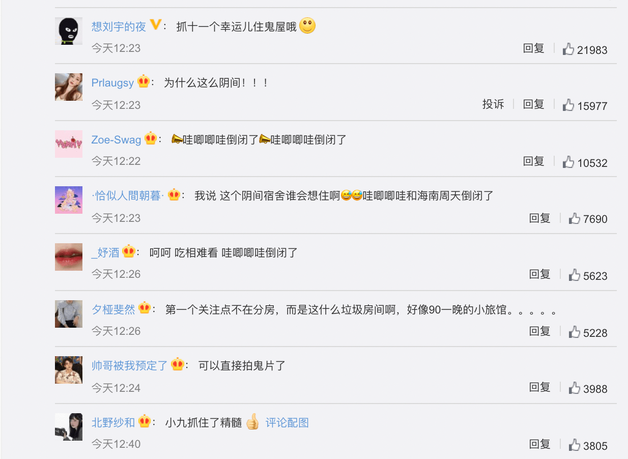 網友紛紛在線吐槽:「抓十一個幸運兒住鬼屋哦!」、「為什麽這麽陰間!!!」、「📣哇唧唧哇倒閉了📣哇唧唧哇倒閉了」、「我說 這個陰間宿舍誰會想住啊😅😅哇唧唧哇和海南周天倒閉了」、「呵呵 吃相難看 哇唧唧哇倒閉了」、「第一個關注點不在分房,而是這什麽垃圾房間啊,好像90一晚的小旅館。。。。。」、「可以直接拍鬼片了」、「小九抓住了精髓」