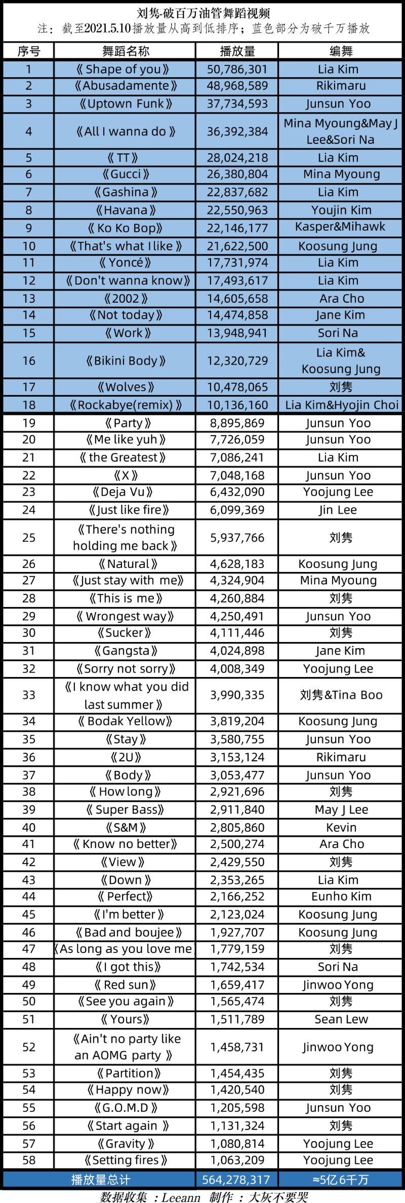 嗚哇!不愧是被稱為舞蹈天花板的劉隽老師啊!!!表示有粉絲將劉隽這5年來,在油管上破了百萬瀏覽量的舞蹈視頻播放量統計,發現截至2021年5月10日,破百萬播放量的有40首,而破了千萬播放量的有18首,總播放量是564,278,317次!嗚哇!!