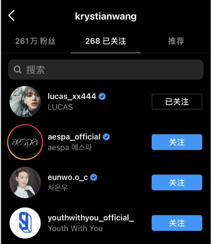 但我們南C的追星魂並沒有這樣停下,一出廠就被粉絲發現,他的INS又追贈關注了3個韓星的INS賬號,分別是車銀優、aespa和Lucas啊!!!