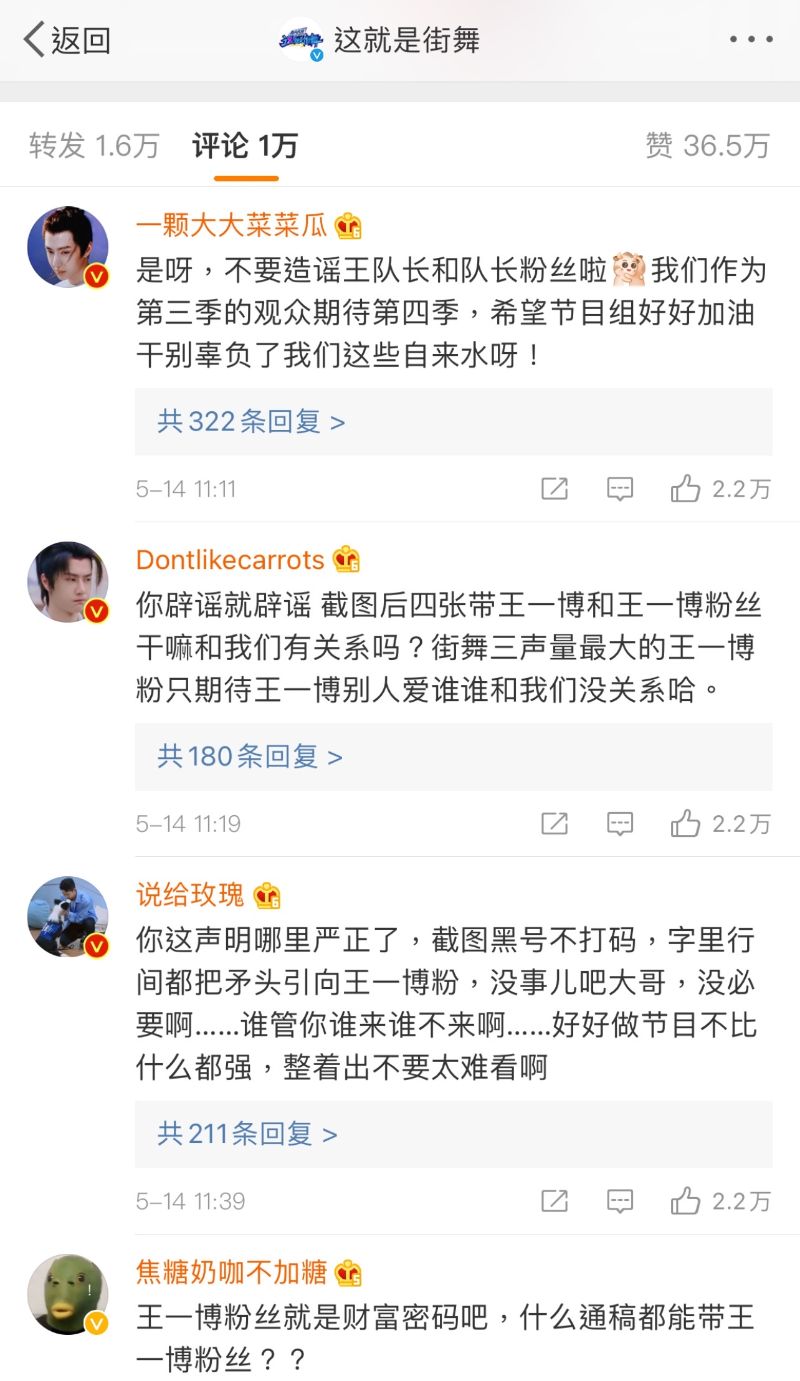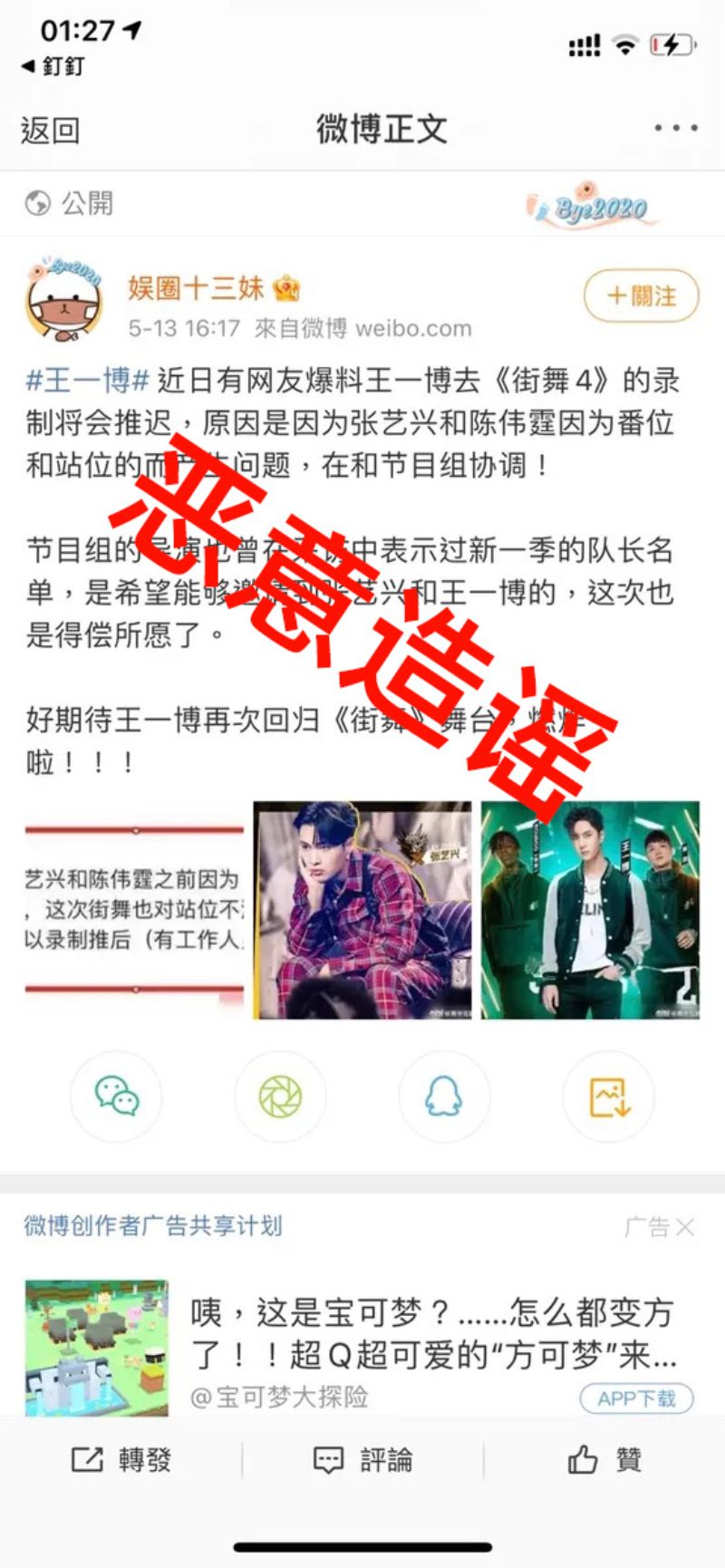 聲明看起來沒問題,但是貼圖也有一波謎之操作的感覺,貼出了營銷號網傳內容,當中全都直指張藝興和陳偉霆因為番位問題,導致王一博錄製街舞的行程被推遲,最後甚至貼出了某家著名”王一博職業黑“的營銷號指是王一博粉絲造謠的事情。這…