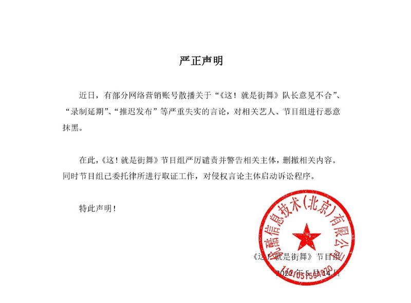 節目組公告表示網絡營銷號散播關於「《這!就是街舞》隊長意見不合」、「錄製延期」、「推遲發佈」等嚴重失實的言論,對相關藝人和節目進行惡意抹黑,將採取法律行動。