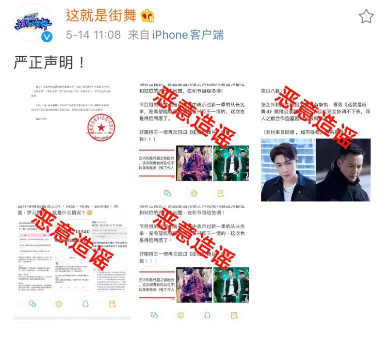 結果《這!就是街舞》官微在14號早上發文,譴責近日數個營銷號惡意造謠有關節目錄製的事宜。