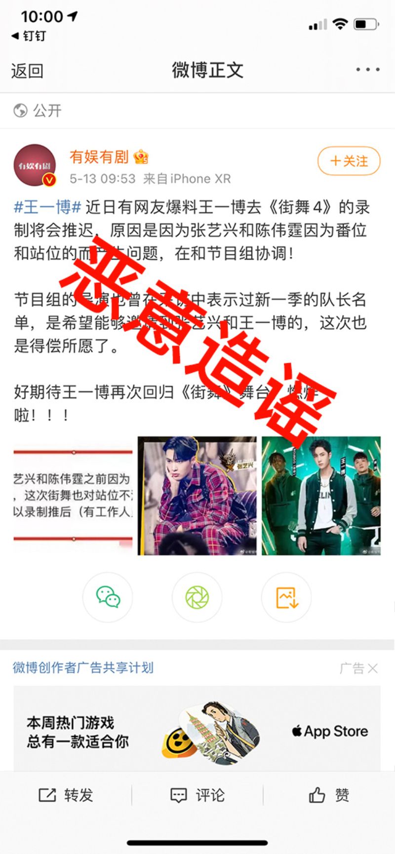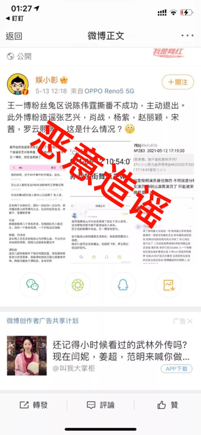 聲明看起來沒問題,但是貼圖也有一波謎之操作的感覺,貼出了營銷號網傳內容,當中全都直指張藝興和陳偉霆因為番位問題,導致王一博錄製街舞的行程被推遲,最後甚至貼出了某家著名”王一博職業黑“的營銷號指是王一博粉絲造謠的事情。這…