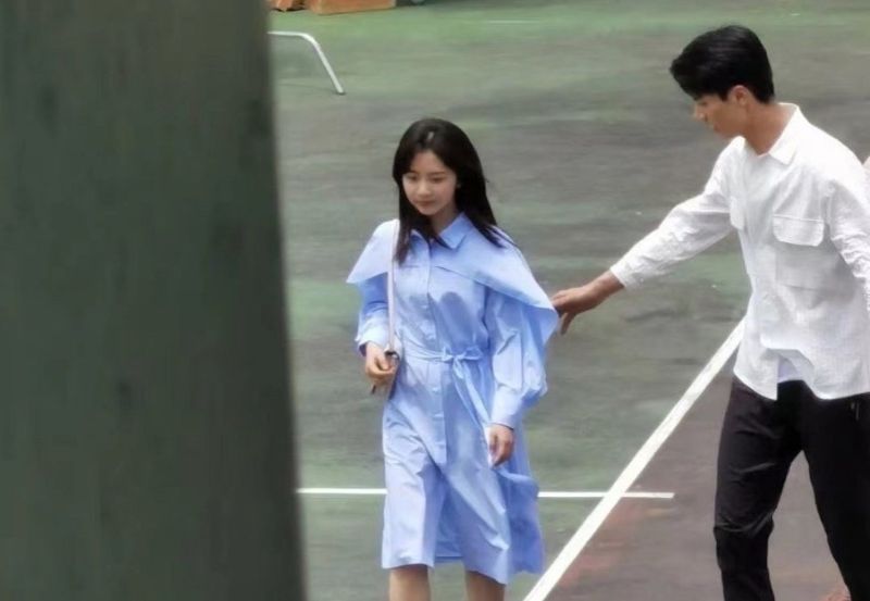 從學生們發出的路透圖來看,我們的晶晶穿著一身藍色連衣裙,非常清新,笑容依舊超級治愈。而和她在一起的則是男二劉暢。