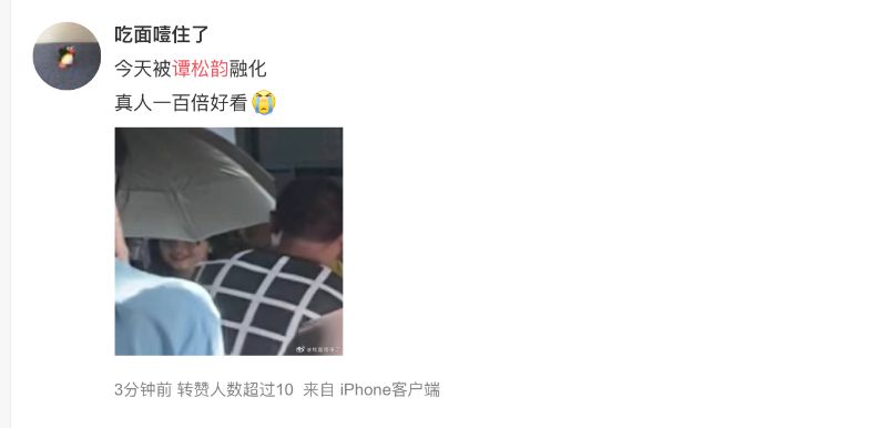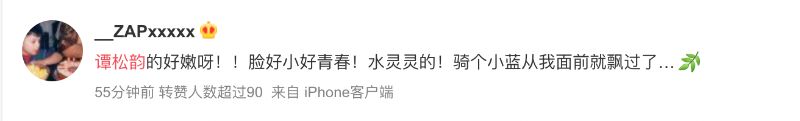 「譚松韻的好嫩呀!!臉好小好青春!水靈靈的!騎個小藍從我面前就飄過了…」
