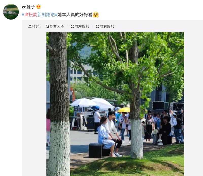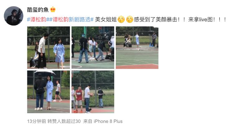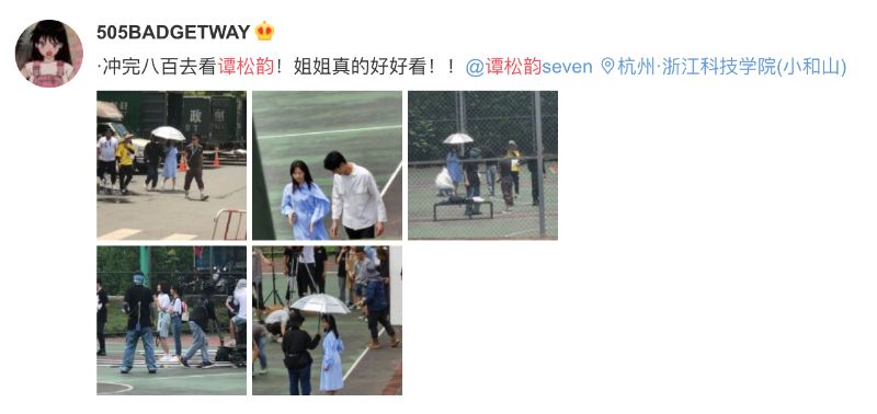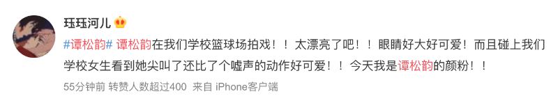 「譚松韻在我們學校籃球場拍戲!!太漂亮了吧!!眼睛好大好可愛!而且碰上我們學校女生看到她尖叫了還比了個噓聲的動作好可愛!!今天我是譚松韻的顔粉!!」