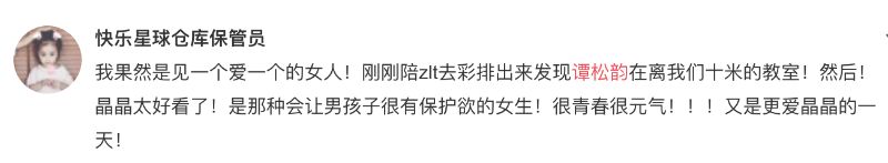 也來看看有幸親眼見到晶晶的學生們的供詞:「我果然是見一個愛一個的女人!剛剛陪zlt去彩排出來發現譚松韻在離我們十米的教室!然後!晶晶太好看了!是那種會讓男孩子很有保護欲的女生!很青春很元氣!!!又是更愛晶晶的一天! 」