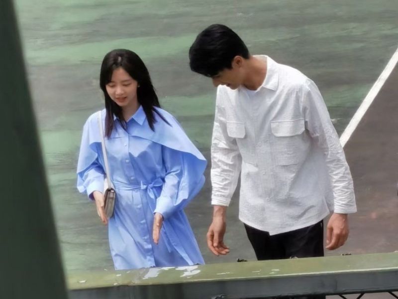 從學生們發出的路透圖來看,我們的晶晶穿著一身藍色連衣裙,非常清新,笑容依舊超級治愈。而和她在一起的則是男二劉暢。