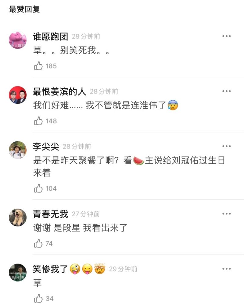 「別笑死我…」、「我們好難…我不管就是連淮偉了」、「我們好難…我不管就是連淮偉了!」、「是不是昨天聚餐了啊?看🍉主說給劉冠佑過生日」、「謝謝!是段星,我看出來了!」