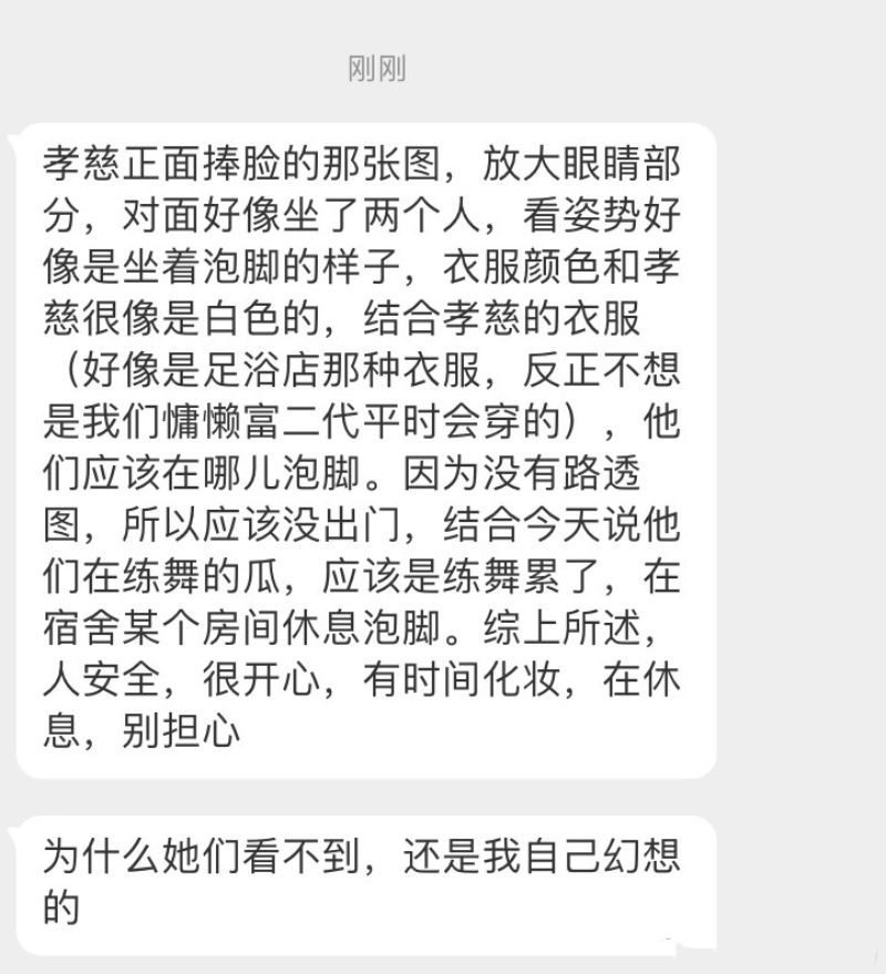 再來就是說自己看見了2個人在坐著泡腳的樣子,衣服顏色和鄧孝慈相似也是白色的,如果結合孝慈穿的衣服,推測他們應該是在泡腳。因為至今沒有路透圖,所以應該沒有出門,再結合說他們今天在練舞的瓜,應該是在宿舍某個房間休息泡腳…