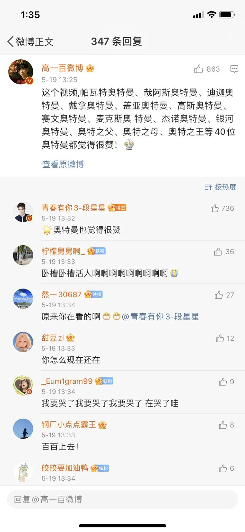 不但更新了微博,還在評論區回復留言!先是回復了同是訓練生的高一百,高一百留言表示:「這個視頻,帕瓦特奧特曼、哉阿斯奧特曼、迪迦奧特曼、戴拿奧特曼、蓋亞奧特曼、高斯奧特曼、賽文奧特曼、麥克斯奧 特曼、傑諾奧特曼、銀河奧特曼、奧特之父、奧特之母、奧特之王等40位奧特曼都覺得很贊![奧特曼]」 星星則回復他:「🌟奧特曼也覺得很贊!」