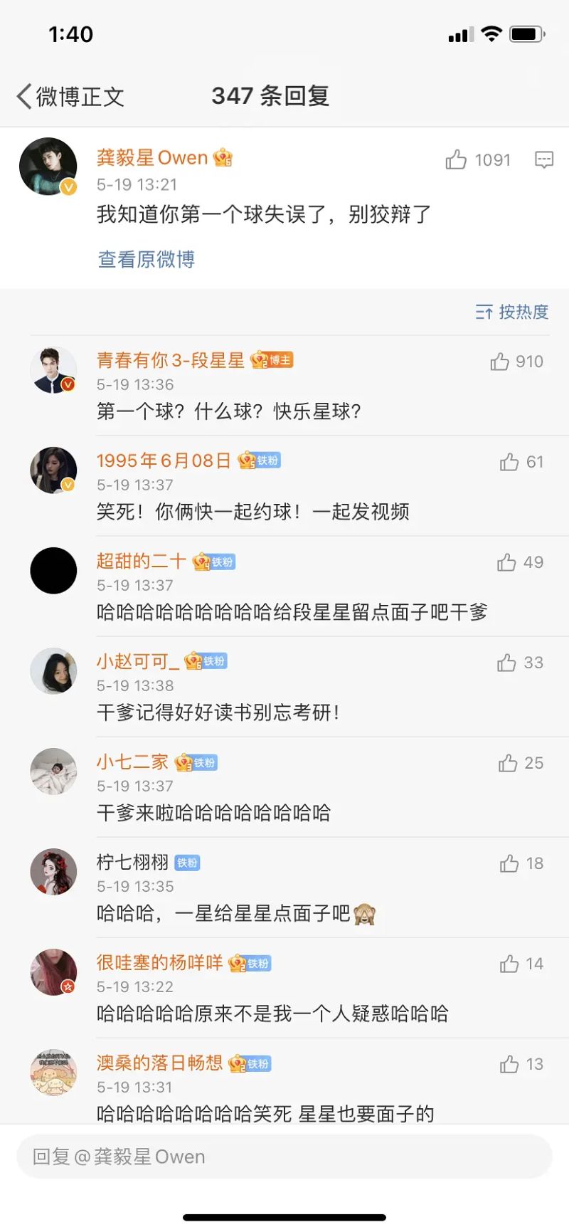 另外也回復了同是訓練生龔毅星的留言:「我知道你第一個球失誤了,別狡辯了!」星星:「第一個球?什麽球?快樂星球?」嗚哇!雖然很冷,但可以看見,下方回復幾乎都在鬼叫!