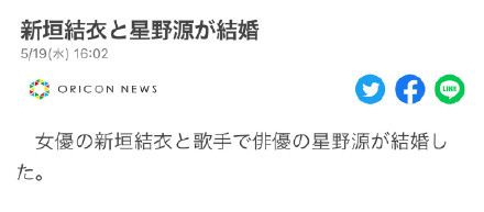 是噠!新垣結衣官宣與星野源結婚!!兩人曾在日劇《逃避雖有用但可恥》中飾演CP,引起十分多的喜愛,之前曾傳聞兩人戀愛,星野源被爆突然搬到新垣住家附近,但兩人都沒有對傳聞回應。2018年有日媒報導,兩人將會閃婚,小倆口為低調保護戀情,還因此雙雙拒演《逃避雖有用但可恥》續集。