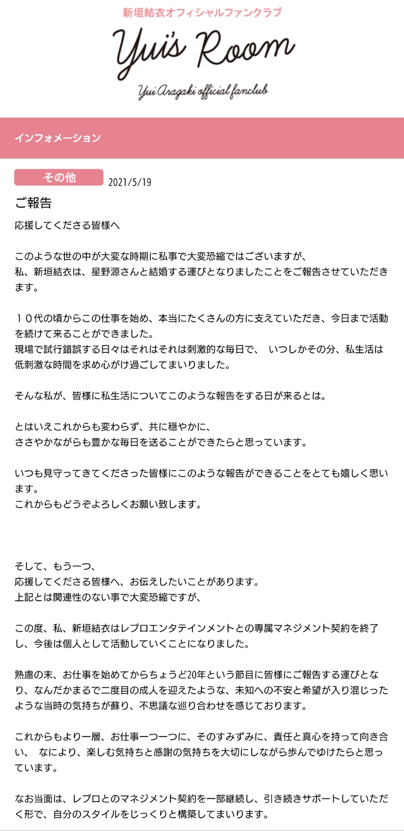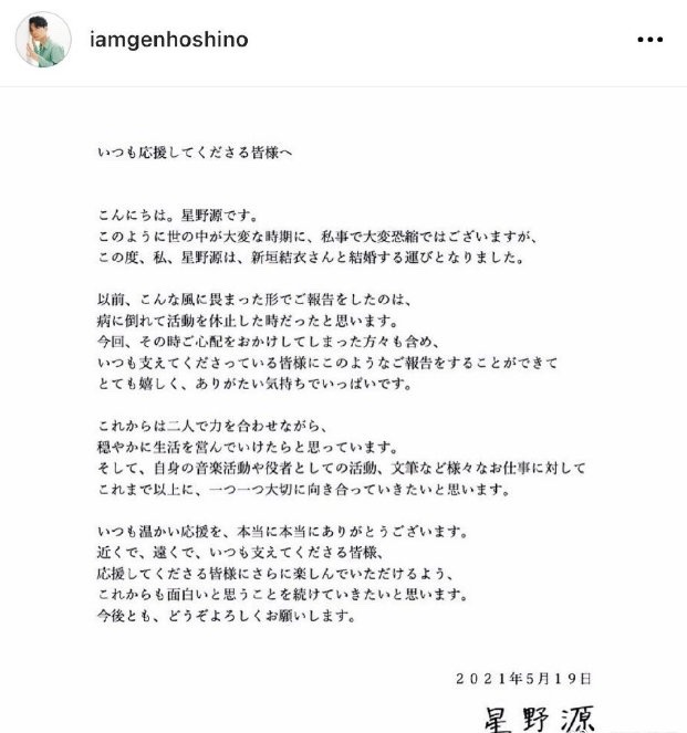 隨後星野源也發文:「一直以來支持我的各位,大家好。 我是星野源,在這個非常艱難的時期,因為私事非常抱歉,這次,我星野源要和新垣結衣結婚了。 希望今後也能互相扶持,積累豐富的時間。 雖然是兩個不成熟的人,但是希望大家能夠給予溫暖地關註今後也請多多關照。 」