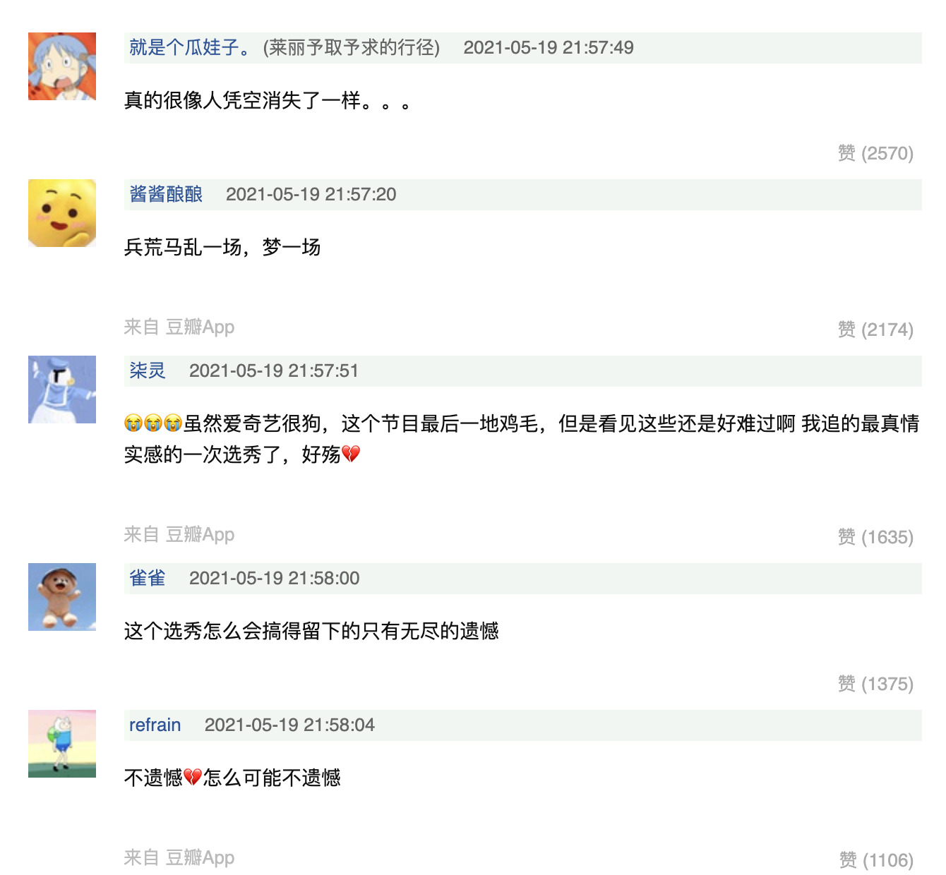 網友熱評:「真的很像人憑空消失了一樣…」、「兵荒馬亂一場,夢一場」、「雖然愛奇藝很狗,這個節目最後一地雞毛,但是看見這些還是好難過啊 我追的最真情實感的一次選秀了,好殇💔」「這個選秀怎麽會搞得留下的只有無盡的遺憾」、「不遺憾💔怎麽可能不遺憾!」