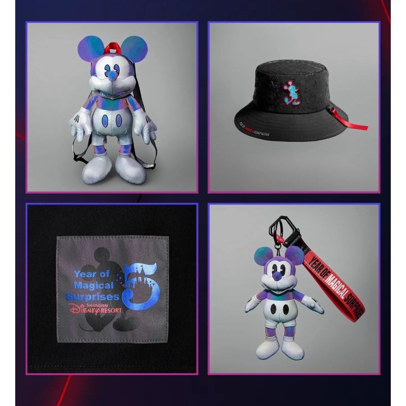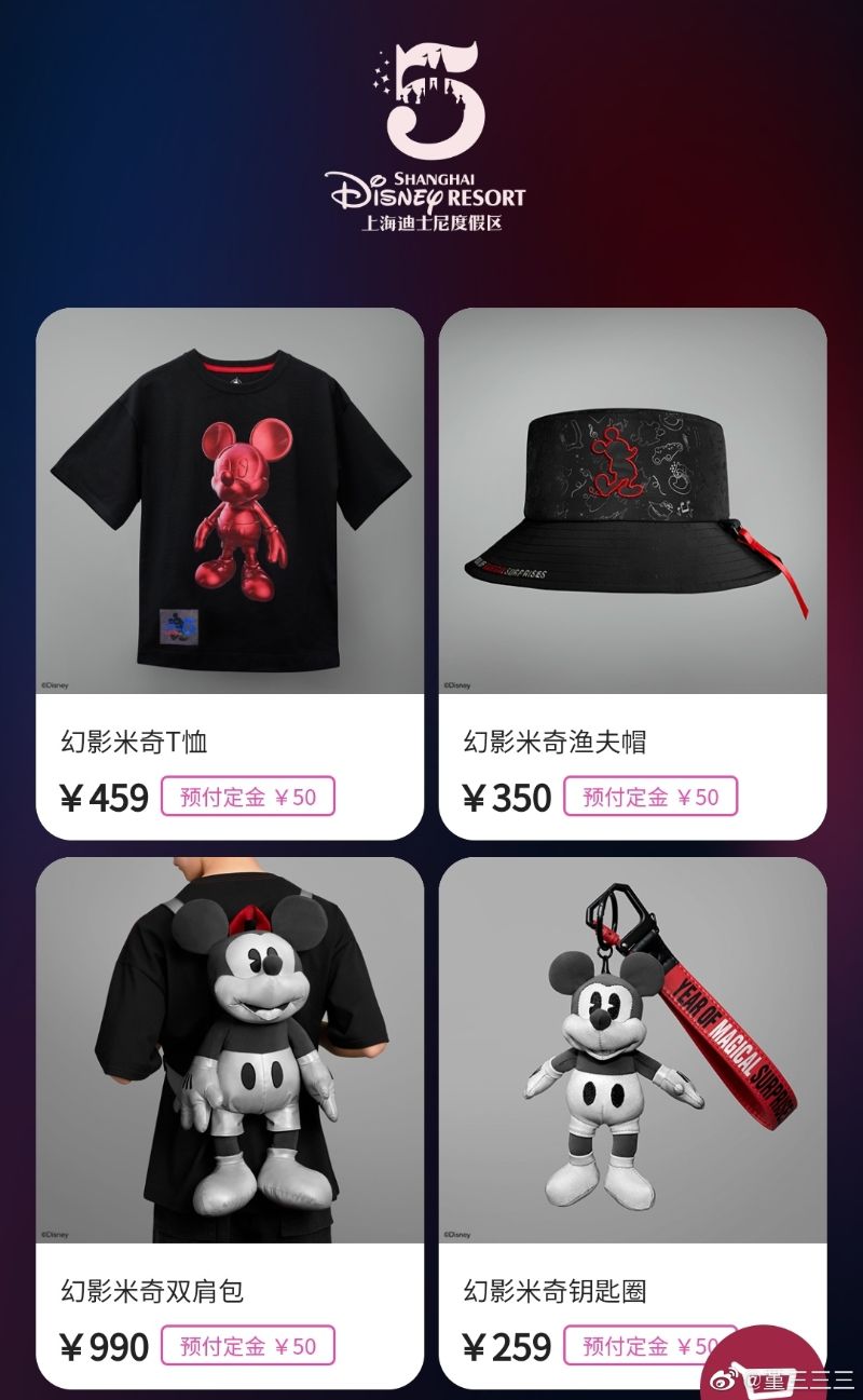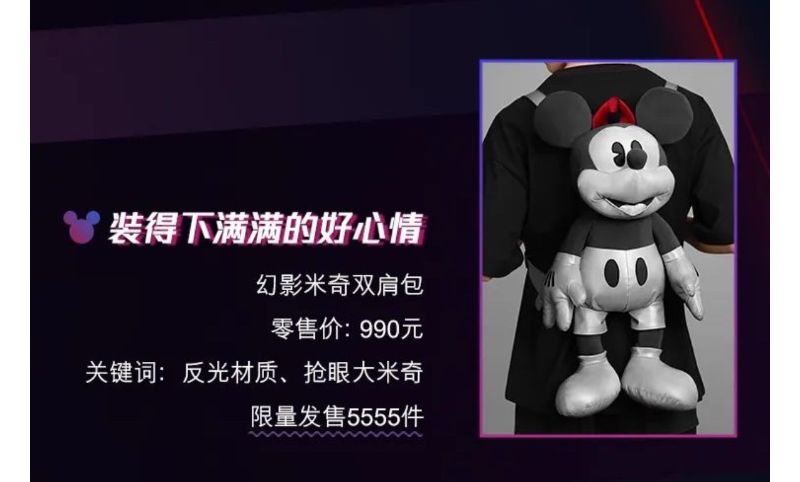 這次配合迪士尼上海度假區5歲生日,易烊千璽參與設計了4款周邊,分別是在發佈會上一直抱著的幻影米奇雙肩包,售價人民幣(下同)990元,限量發售5555件!