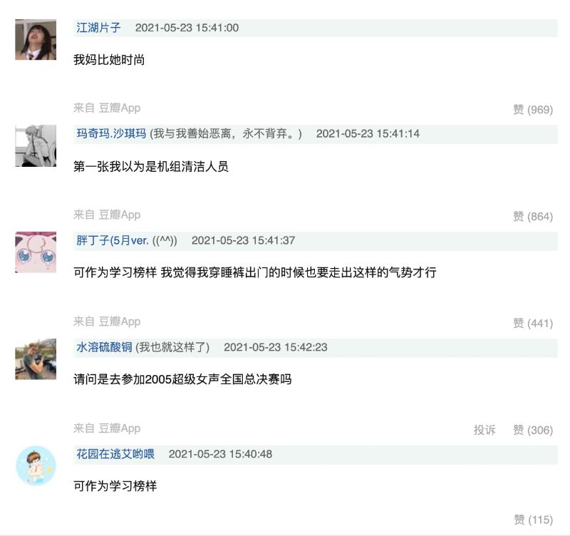 而對於孟美岐的造型,網友紛紛留言,當中熱評包括了:「我媽比她時尚」、「第一張我以為是機組清潔人員」、「可作為學習榜樣,我覺得我穿睡褲出門的時候也要走出這樣的氣勢才行」、「請問是去參加2005超級女聲全國總決賽嗎?」、「可作為學習榜樣」