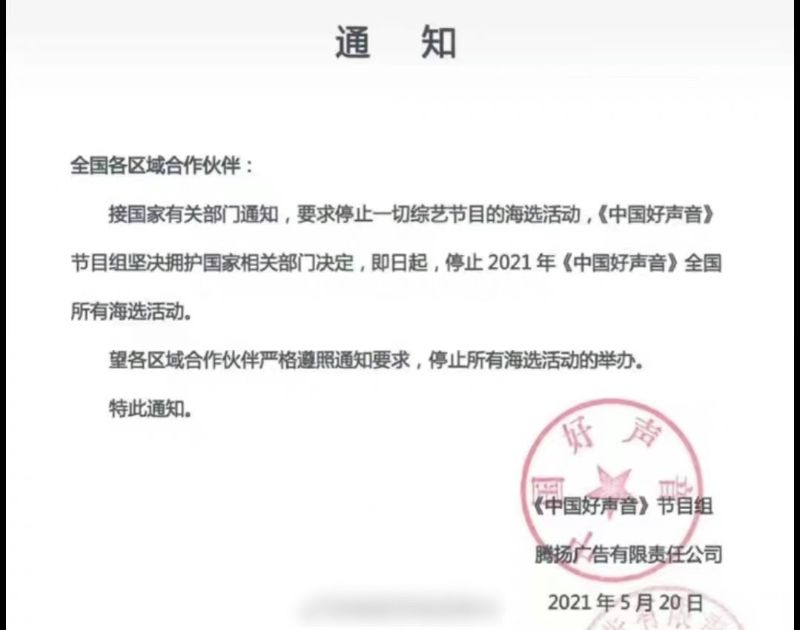 在通告中,表示「接國家有關部門通知,要求停止一切綜藝節目的海選活動,《中國好聲音》節目組堅決擁護國家相關部門決定,即日起,停止2021年《中國好聲音》全國海選活動。」