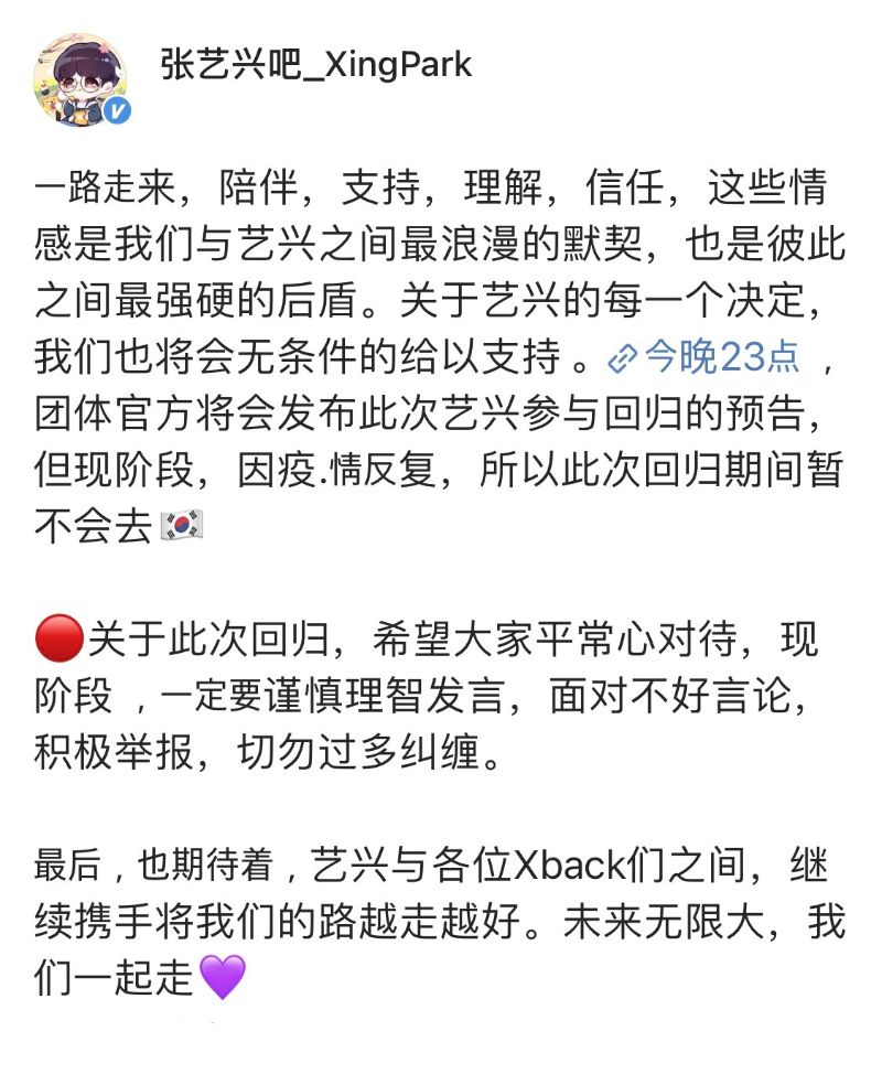 張藝興吧全文:「一路走來,陪伴,支持,理解,信任,這些情感是我們與藝興之間最浪漫的默契,也是彼此之間最強硬的後盾。關于藝興的每一個決定,我們也將會無條件的給以支持 。26日晚七點,團體官方將會發布此次藝興參與回歸的預告,但現階段,因疫情反複,所以此次回歸期間暫不會去韓國。