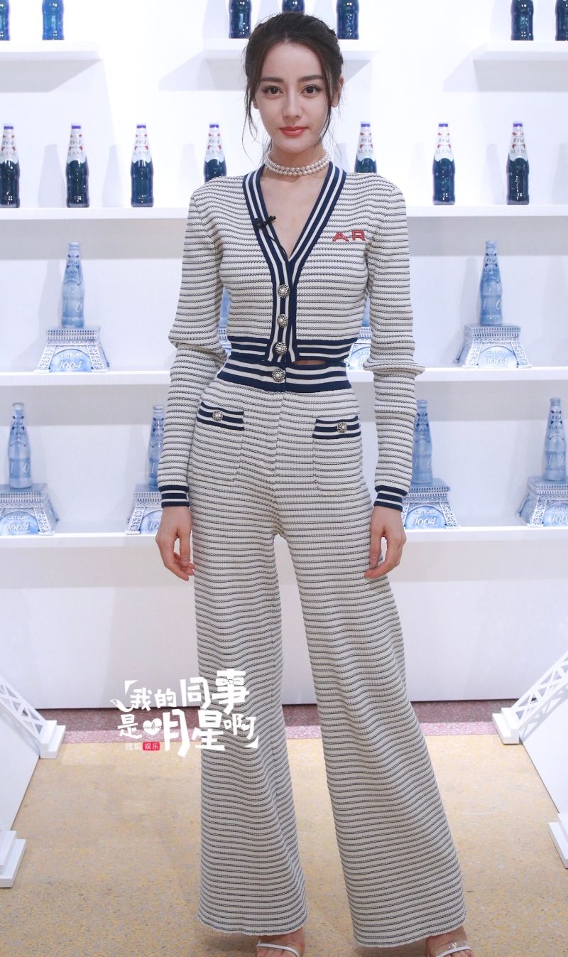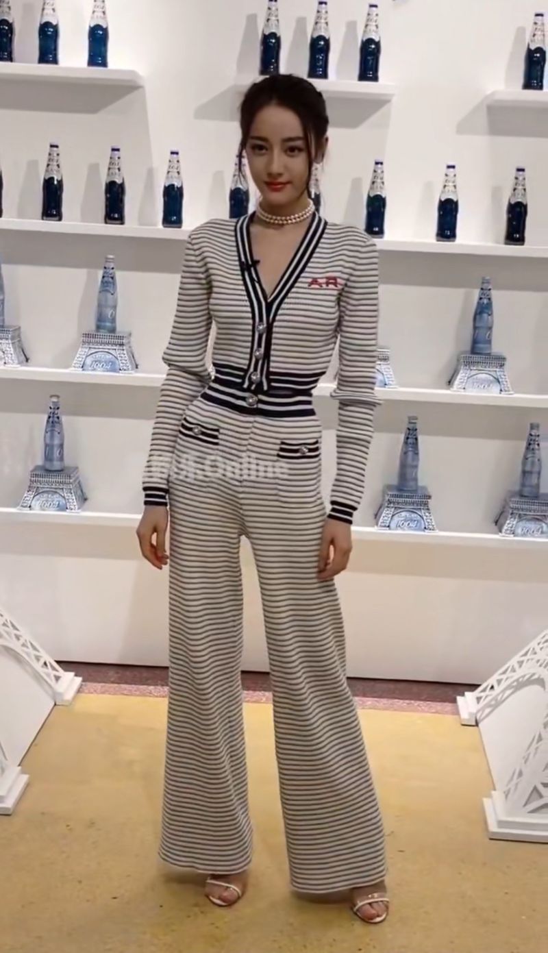 第二套熱巴穿了藍白條紋針織套裝,雖然是橫紋但視覺上也沒顯胖,因為熱巴真的超瘦!來看看側面圖~