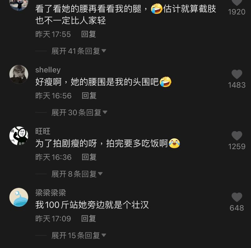 來看看網友熱評:「看了看她的腰再看看我的腿,估計就算截肢也不一定比人家輕。」、「好瘦啊,她的腰圍是我的頭圍吧!」、「為了拍劇瘦的啊,拍完要多吃飯啊!」、「我100斤(50kg)站她旁邊就是個壯漢。」