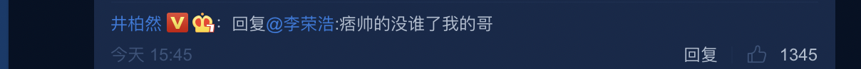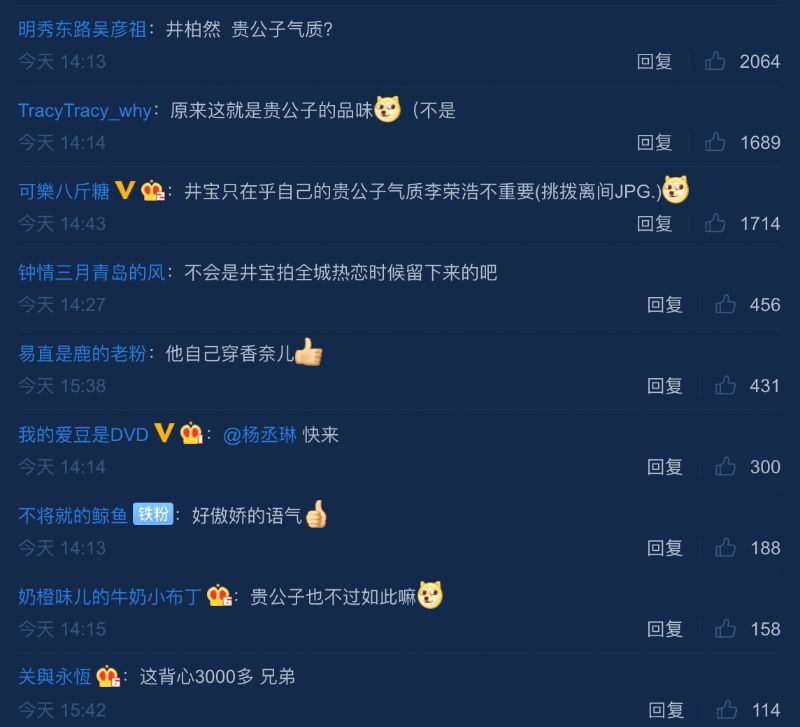 於是粉絲立刻開啟花式挑撥兄弟感情模式,紛紛留言表示:「井柏然?貴公子氣質?」、「原來這就是貴公子的品味(不是)」、「井寶只在乎自己的貴公子氣質李榮浩不重要(挑撥離間JPG.)」、「不會是井寶拍全城熱戀時候留下來的吧!」、「他自己穿香奈兒[good]」、「@楊丞琳 快來!」、「好傲嬌的語氣」、「貴公子也不過如此嘛!」