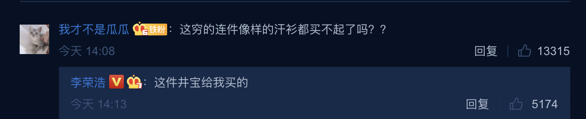 結果一向愛和正主互懟的粉絲就調侃:「這窮的連件像樣的汗衫都買不起了嗎??」沒想到李榮浩很傲嬌的回復:「這件井寶給我買的!」