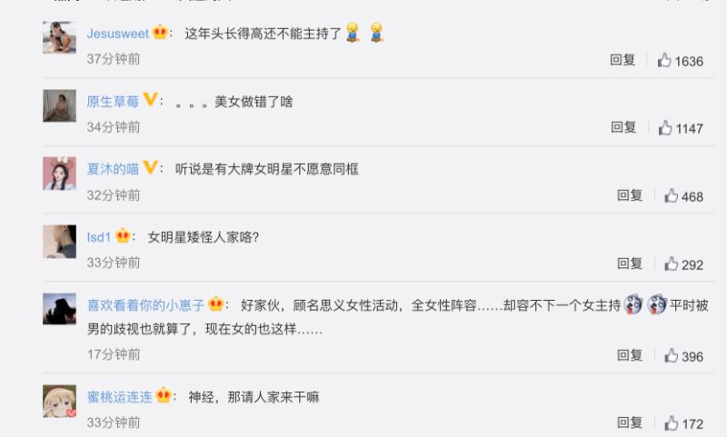 來看網友熱評:「這年頭長得高還不能主持了[跪了][跪了]」、「 。。。美女做錯了啥」、「聽說是有大牌女明星不願意同框」、「女明星矮怪人家咯?」、「好家夥,顧名思義女性活動,全女性陣容……卻容不下一個女主持[二哈][二哈]平時被男的歧視也就算了,現在女的也這樣……」、「神經,那請人家來幹嘛」