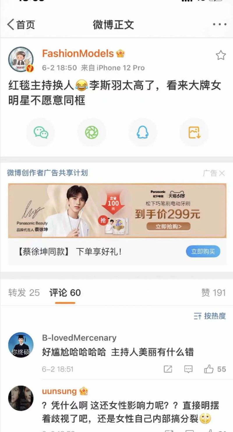 後來有博主說嘉人紅毯中場主持人被換,是因為有女明星不能接受和180+的李斯羽同框??