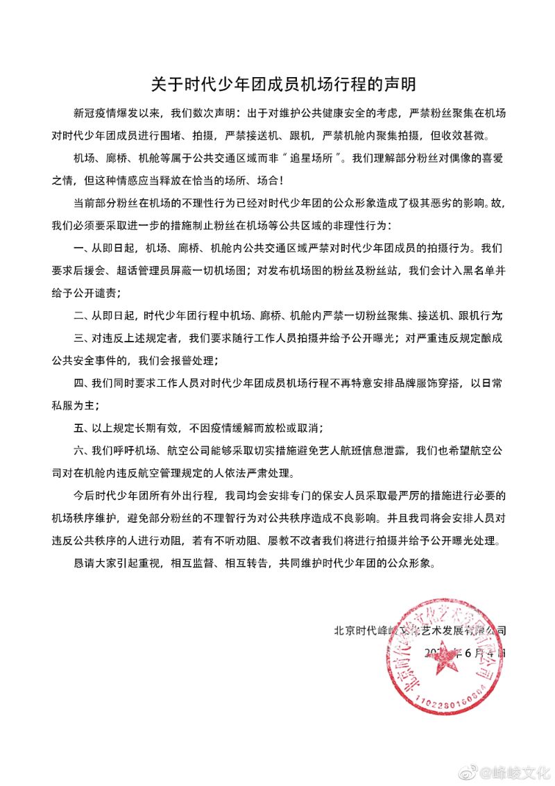 一、從即日起,機場、廊橋、機艙內公共交通區域嚴禁對時代少年團成員的拍攝行為。我們要求後援會、超話管理員屏蔽一切機場圖;對發布機場圖的粉絲及粉絲站,我們會計入黑名單並給予公開譴責;