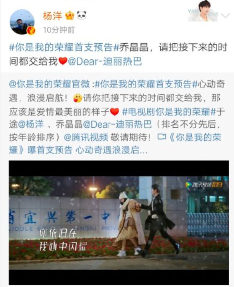 楊洋和迪麗熱巴也在微博高甜互動,不但發了預告宣傳,還互相代入角色喊話:「于途,遇見你就是愛情最美的樣子!」,而楊洋則回應:「喬晶晶,請把接下來的時間都交給我!」嗚哇!我的媽!這個夏天就是iBG的天下,能不能明天立刻定檔啊!!!
