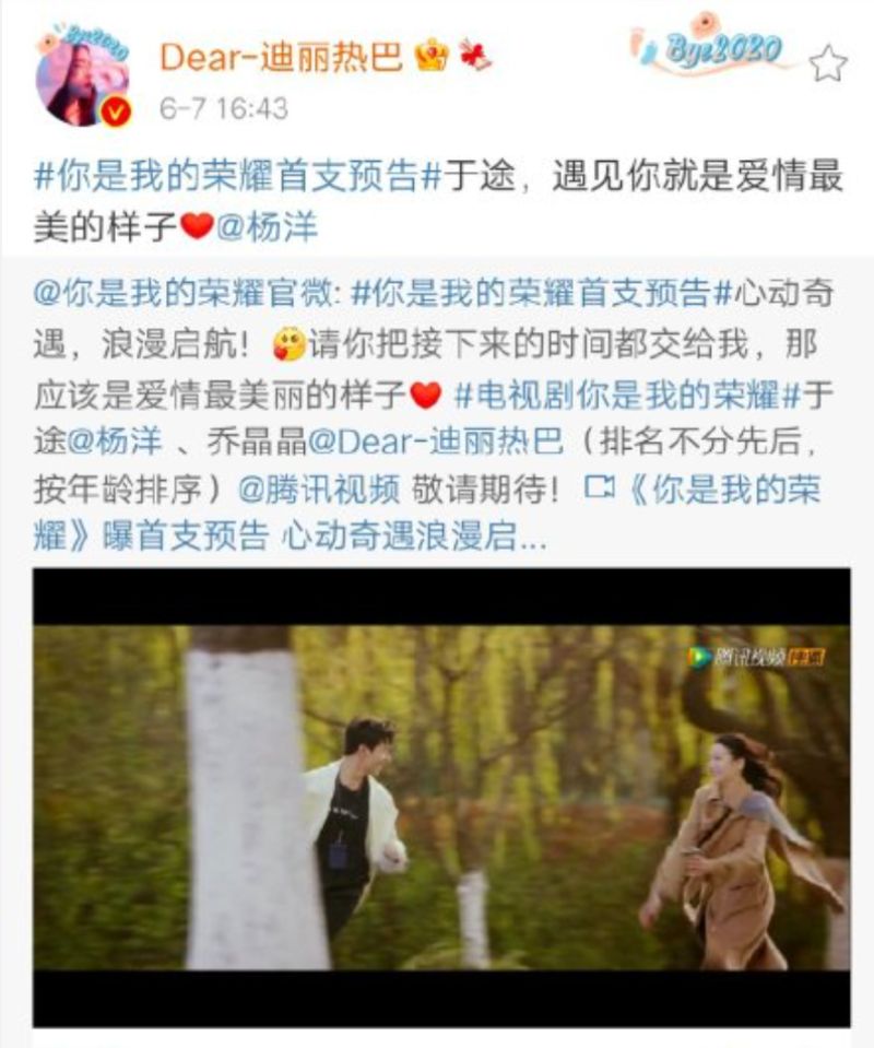 楊洋和迪麗熱巴也在微博高甜互動,不但發了預告宣傳,還互相代入角色喊話:「于途,遇見你就是愛情最美的樣子!」,而楊洋則回應:「喬晶晶,請把接下來的時間都交給我!」嗚哇!我的媽!這個夏天就是iBG的天下,能不能明天立刻定檔啊!!!