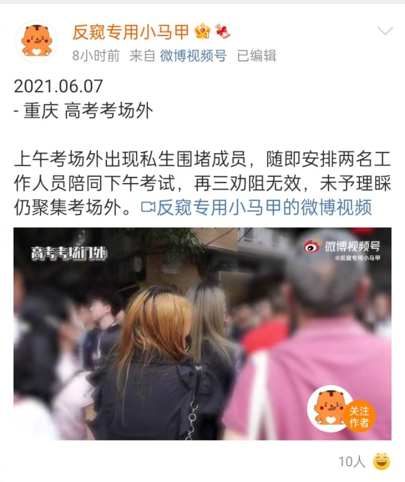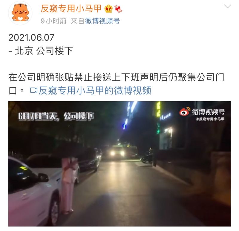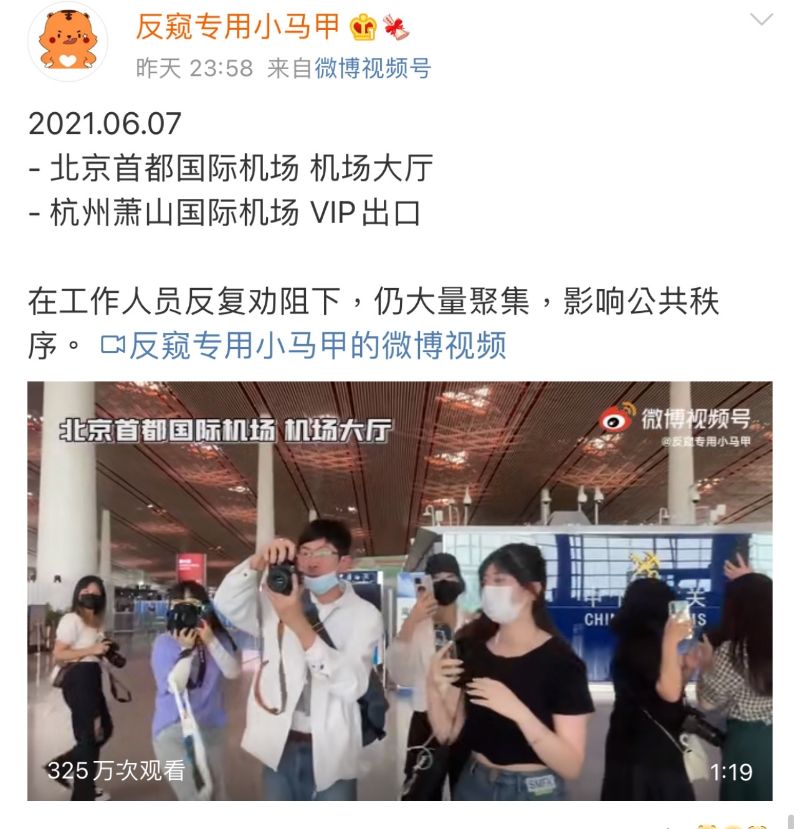 於是…時代峰峻在7號晚上開通了掛專挂私生微博『反窺專用小馬甲』,曬出了6月7日這天五段在機場、酒店內部、公司門口、高考考場外成員被圍堵跟拍的視頻,並標注了詳細的時間、地點、和事件經過。