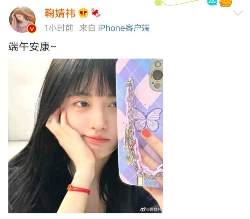 鞠婧緯曬自拍祝大家端午安康!不過感覺今天的樣子有點不同,是素顏嗎?