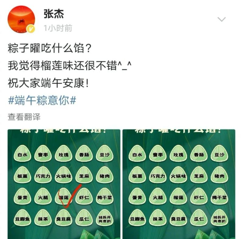 張杰那邊發文說覺得榴蓮味的粽子很不錯!!那娜娜是吃了榴蓮口味的嗎?
