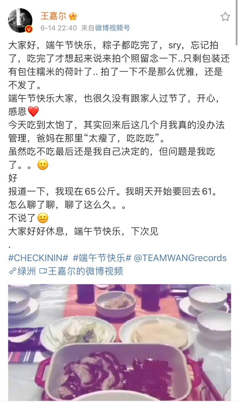 王嘉爾真的太可愛了啊!!!表示配合端午節,王嘉爾久違的公開了”碎碎唸“式微博,不但曬出了自己吃的端午節晚餐,還公開了自己的最新體重!