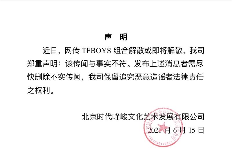 沒錯,6月15日最新的聲明:「網傳TFBOYS組合解散或即將解散,我司鄭重聲明:該傳聞於事實不符!」重點get起來…即將解散也不是事實喲!