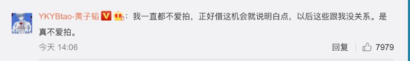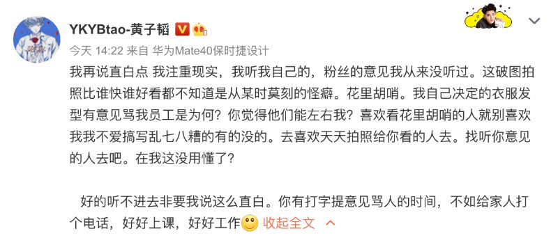 沒想到半個小時之後,黃子韜再發文,這次直接表示接下來停止一切平面拍攝!黃子韜全文如下:「我再說直白點 我注重現實,我聽我自己的,粉絲的意見我從來沒聽過。這破圖拍照比誰快誰好看都不知道是從某時莫刻的怪癖。花裡胡哨。我自己決定的衣服發型有意見罵我員工是為何?你覺得他們能左右我?喜歡看花裏胡哨的人就別喜歡我我不愛搞寫亂七八糟的有的沒的。去喜歡天天拍照給你看的人去。找聽你意見的人去吧。在我這沒用懂了?